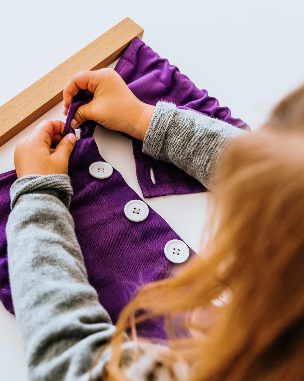 Este é o telaio de colchetes de pressão, componente do enxoval da área de Vida Prática. Hoje ele nos inspira para uma reflexão que ultrapassa sua bela aparência. “[A criança] deseja agir por sua própria vontade, isto é, quer
